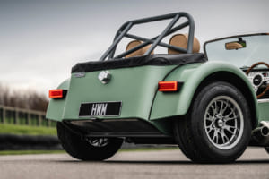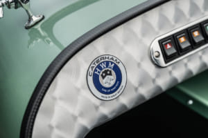 サスペンションのウィッシュボーン、アンチロールバー、ヘッドライトブラケットなどはレトログレーのパウダーコートで仕上げられている。中央に配置されたクローム仕上げのフューエルフィラーキャップや、特注のHWMケータハム・ノーズコーンバッジも、このモデルの特別感を際立たせている。