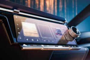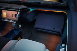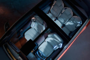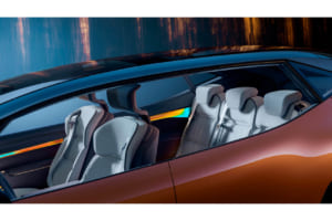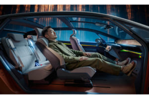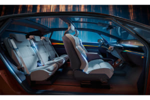湾曲した「openR」パノラマスクリーンがダッシュボードの全幅を占める一方で、助手席側はエアバッグをシートに組み込むことでダッシュボードを解放し、足を伸ばしてリラックスできるスペースをも生み出す多機能グローブボックスを備えている。さらに、車載AIがドライバーをサポートし、触覚式アルコール検知器などの新しいデバイスを探索するなど、人間中心のアプローチで技術が活用されている。