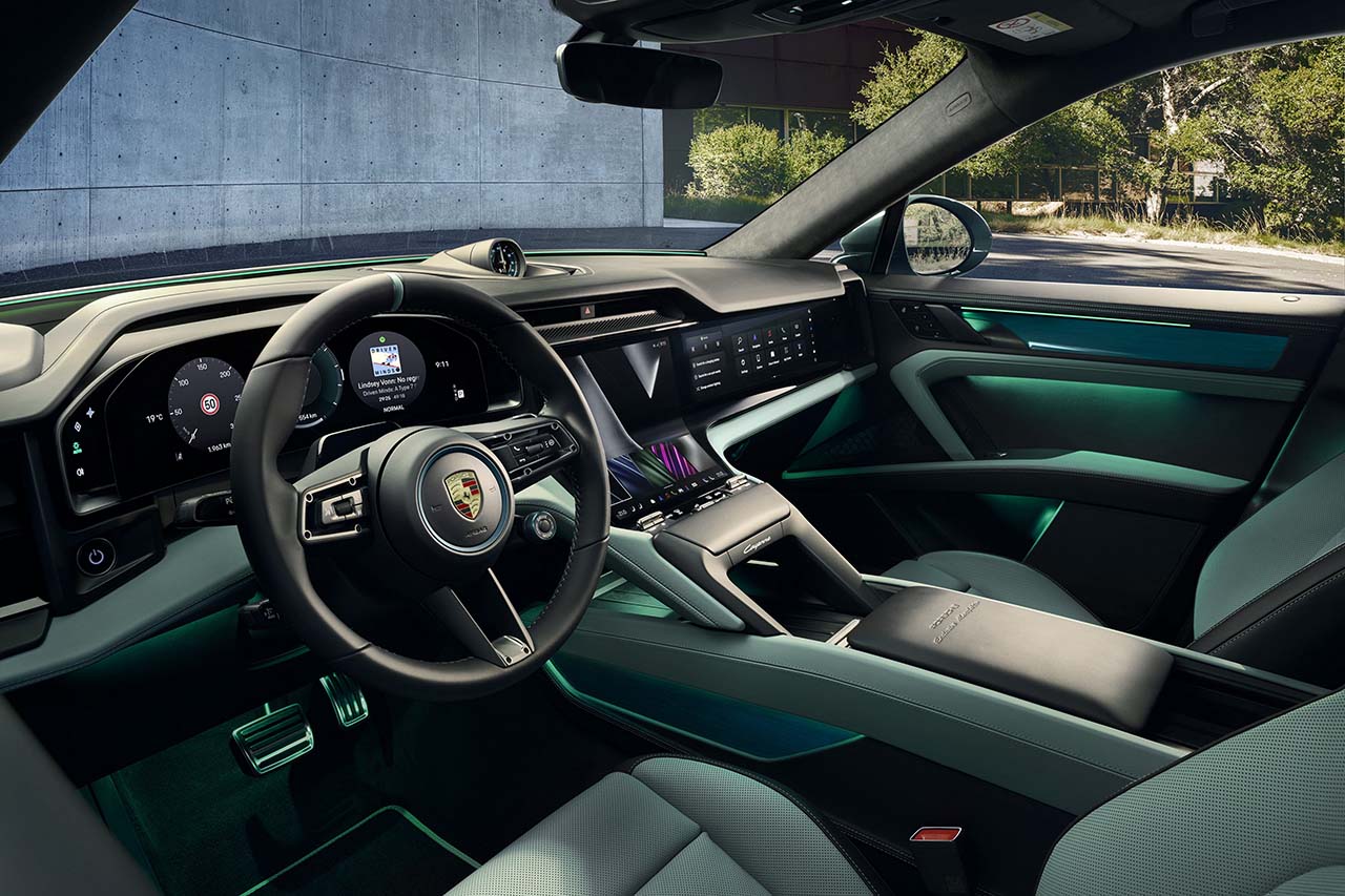 さらに、シルバーカラーのアクセントパッケージや、“Porsche Exclusive Manufaktur”とエンボス加工されたセンターコンソール・アームレストも装備。車両キーもイザバルグリーンで、デルガダグリーンのデコレーティブステッチが施されたケースに収められる。モデル名がグリーンにライトアップされるブラックアルマイト仕上げのアルミニウム製ドアエントリーガードと、デコレーティブエッジやエンブレム、ステッチを施したブラックのフロアマットなども装備される。