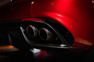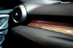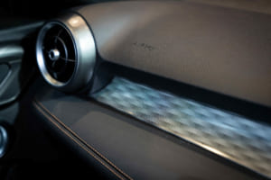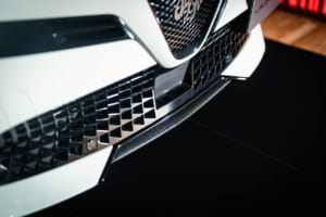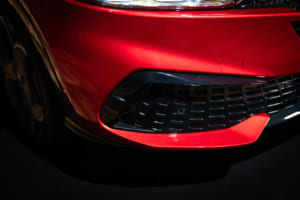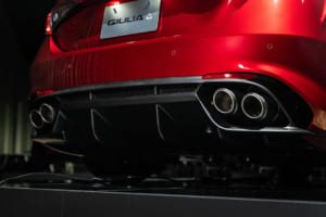 続いてプロダクトマネージャーの児玉英之氏から詳細が語られた。ブランドを象徴する盾形グリル「スクデット」は、1967年型をルーツとする「33ストラダーレ」などにも通じる造形を現代的にアレンジし、より立体的で存在感のあるボーダーライン模様のデザインへと生まれ変わった。さらに、スクデットの横には「アゾレ」と呼ばれる4つの開口部が新たに採用された。児玉氏は「156の初期型ですとか、あるいはジュリア クアドリフォリオのGTA、これらからインスピレーションを得たヘリテージです」と説明。この変更に伴いフロントバンパーのエアインテークも拡大され、ラジエーターの冷却効率と空力性能が向上している。
