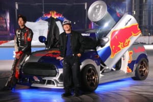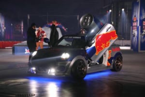 見逃せないのが、FDJに参戦する「Red Bull GR カローラ」をサポートするクスコレーシング(キャロッセ株式会社)が製作した「Red Bull Drift Mini」だ。フレームから作り直してFRレイアウトに変更し、パワフルなモーターへスワップ。エスアンドカンパニーの施工によるガルウィングドアを装備したこのマシンを箕輪大也がドライブし、助手席には角田裕毅が同乗。安定感抜群の深いドリフトアングルを披露した。