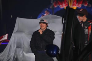 そしてこの夜、最大のサプライズとなったのがF1マシンのアンベールだ。フォード・マスタングに乗ったリアム・ローソンとアービッド・リンドブラッドが登場した後、マッド・マイク・ウィデットが操る「Red Bull Drift Mini」がF1マシンの周囲をドリフトで旋回。目隠しのベールが外されると、3月31日発売の「レッドブル・エナジードリンク チェリーエディション」をモチーフにした、白と赤の「Visa Cash App Racing Bulls」スペシャルリバリーが世界初公開され、会場のボルテージは最高潮に達した。