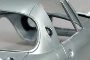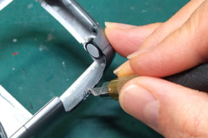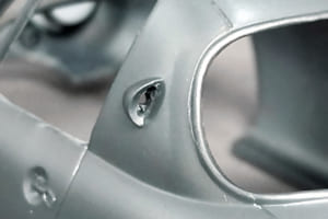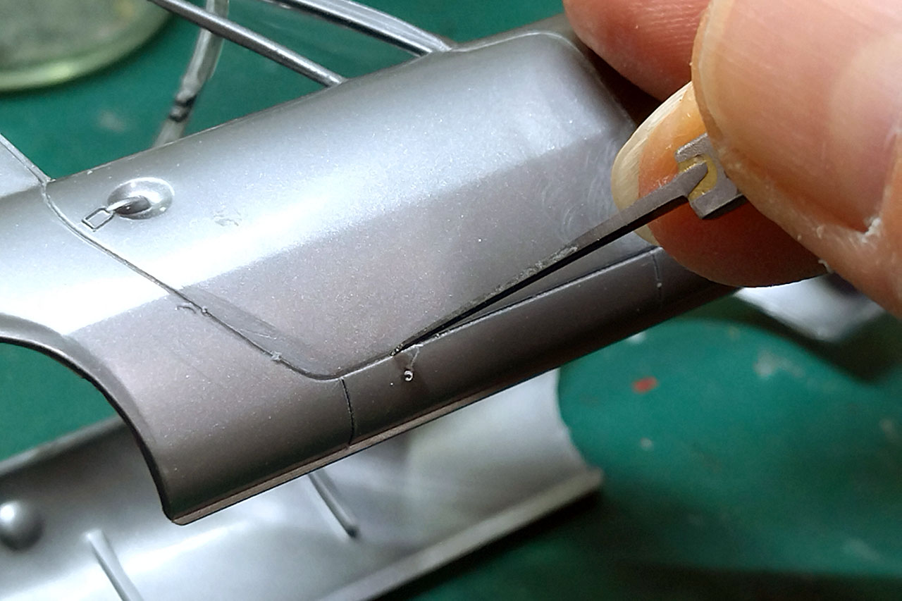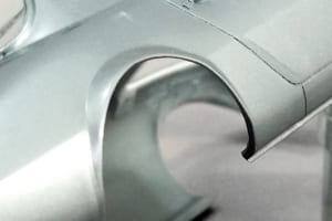 このガッカリ感の正体は、外装細部の実車との違いの集積による「違和感」だ。プレス加工した鉄板の組み合わせである実車と、スチロール樹脂の一体成型であるプラモデル。作り方が違えばおのずと質感も違ってくる。そこで塗装の前に細部を作り込むことで、その違いを少しでも減らそうというわけだ。