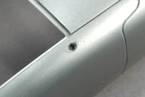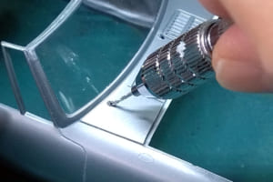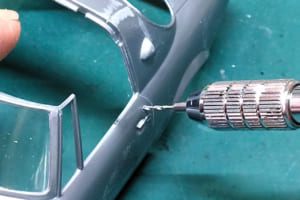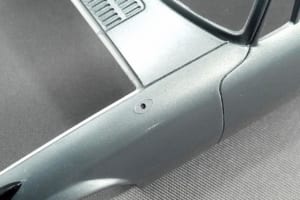 ヨタハチのボディでまず気になるのは、一体モールドされているリアピラーのエアダクト。後方から見ると中が埋まっていてプラの塊なのが判ってしまう。外側から1mm径のドリルで孔を3つほど開け、デザインナイフと精密ヤスリを使ってそれを繋いだ。ダクトのフチが薄くなり、プレス形状に見えるようになった。