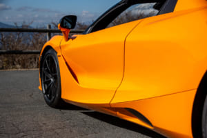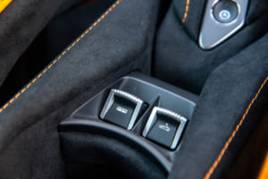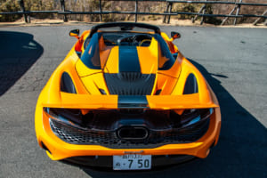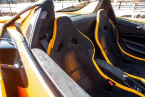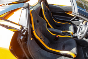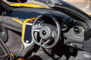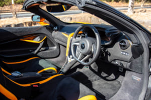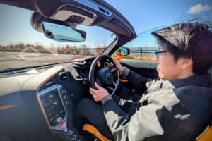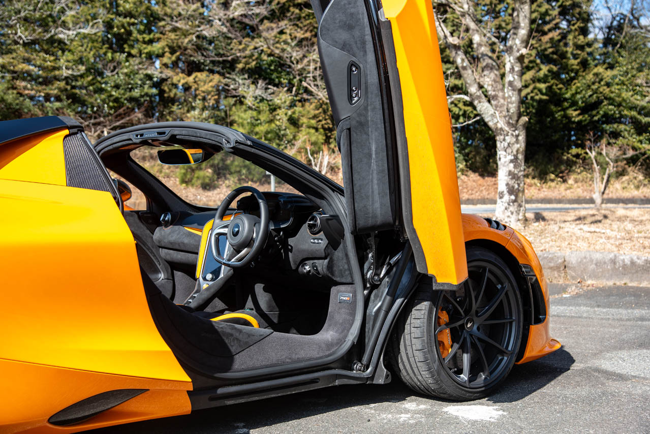 それでも、怖いもの見たさを含めて、走りへの欲求は抗えない。色鮮やかなオレンジにブラックのカーボンファイバーパックを組み合わせたコントラストカラーを纏う750Sスパイダーの、ディヘドラルドアを開け、極太のサイドシルをまたいで乗り込む。いかにもマクラーレンらしい所作であり、これだけで気分はF1ドライバーだ。