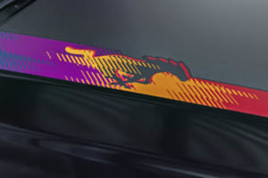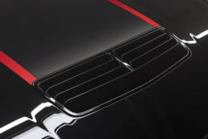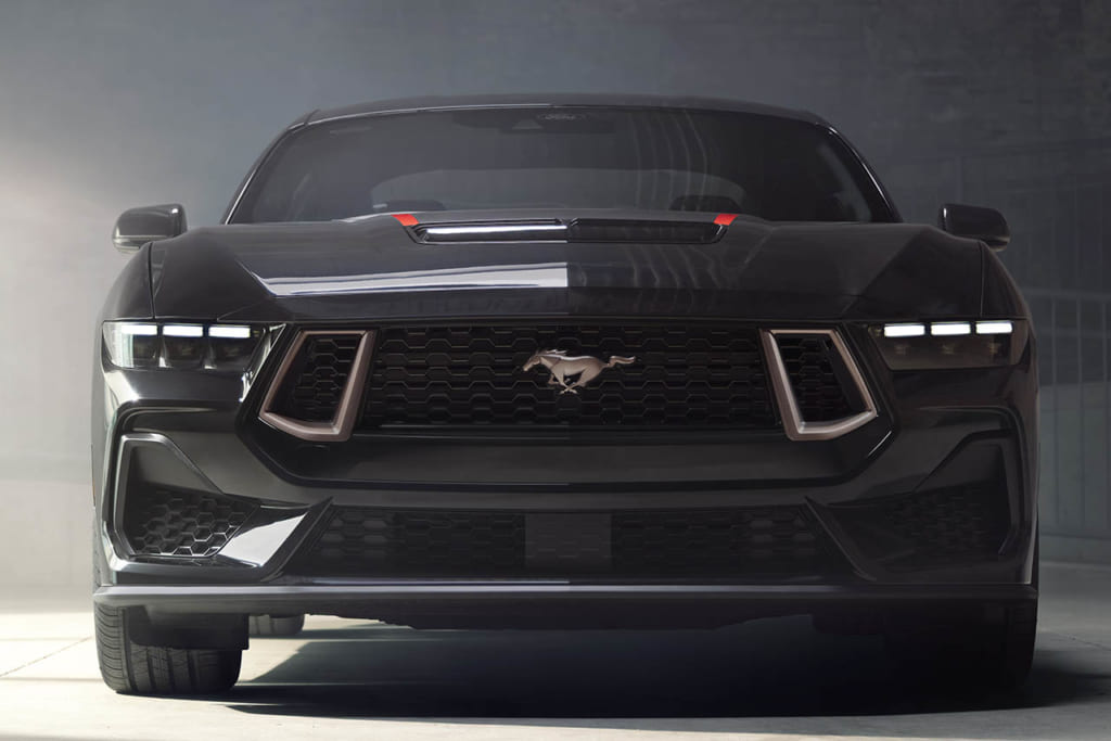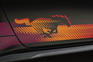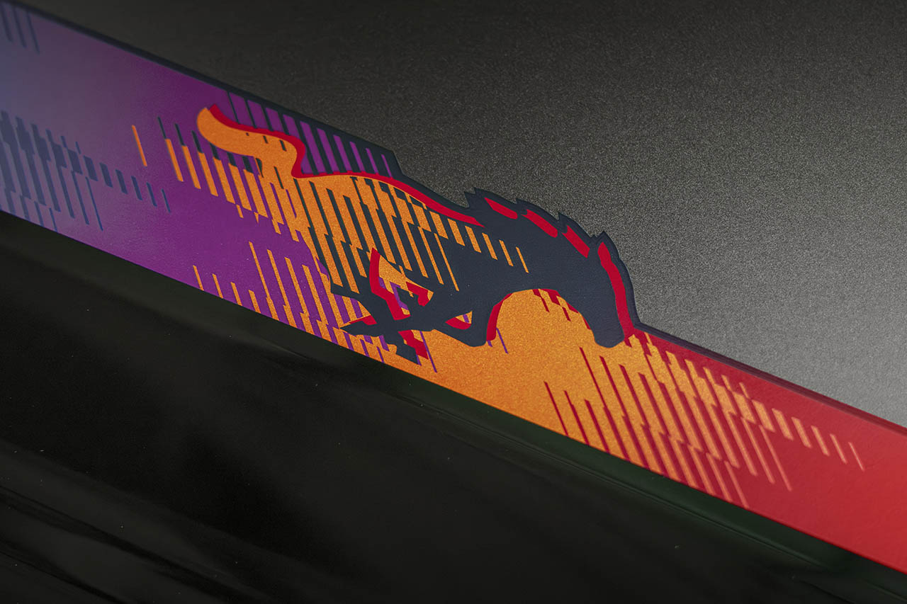 さらにこのパッケージでは、外観の差別化をより明確にするため、上位グレードであるマスタングGTのボンネット、フロントフェイシア、そしてグリルが特別に採用された。ボンネット上にもカラフルなグラフィックが施されるほか、グリル両端の吸気口や中央のポニーバッジもシニスターブロンズで統一され、クリエイティビティあふれる仕上がりとなっている。また、室内空間はカーマインレッドの専用内装となっており、特別感を引き立てるシリアルナンバー入りのインパネバッジも装着される。