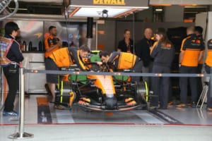 各チームのホスピタリティテントからはコーヒーの香りが漂い、談笑するゲストたちの姿がある一方で、ヘッドホンで音楽を聴きながら集中力を高めて歩くドライバーや、電動キックボードで移動するスタッフの姿はパドックの日常風景。