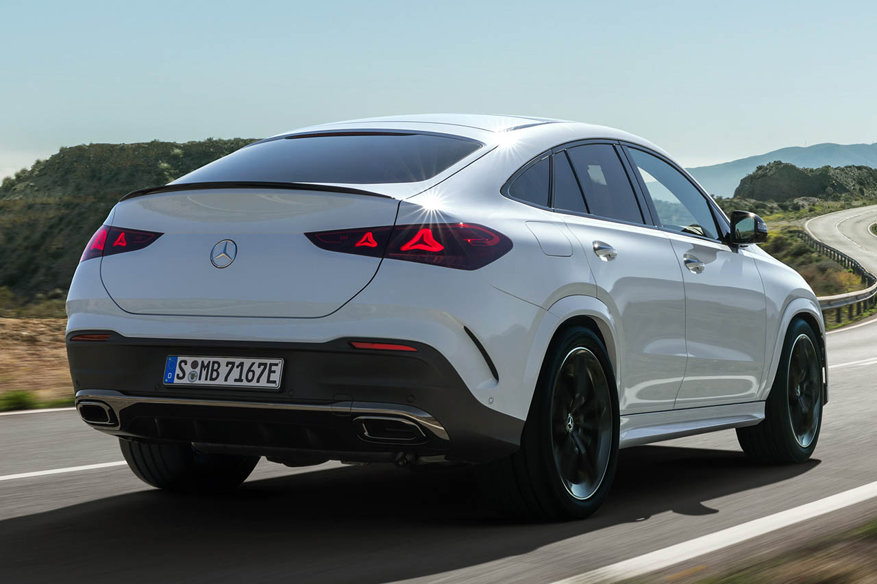 新型GLEクーペは、表情豊かなフロントマスクが特徴である。新設計のヘッドライトには2つのスターシグネットが組み込まれ、ブラックパネルを通じて大型化されたグリルと一体感のあるデザインを形成する。グリル中央のイルミネーテッド・セントラルスターや新しいフロントエプロンが力強い存在感を主張し、立体的なスターシグネットをあしらったテールランプがスポーティな個性を際立たせている。