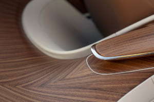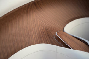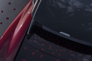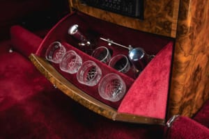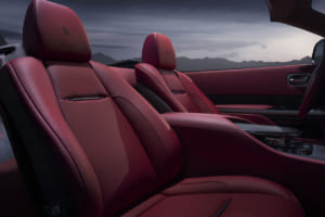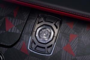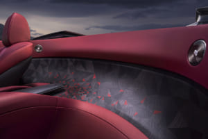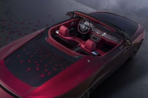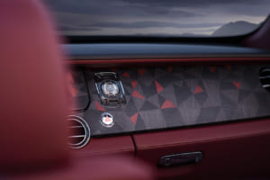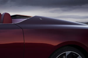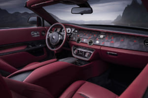 ブラック・バカラ・ローズにインスパイアされ、見る角度で色が変わる150回のテストを経た「トゥルー・ラブ」レッドで塗装されたドロップテイル。内装には1,603個のブラックシカモア材を用いた複雑な寄木細工で舞い散るバラの花びらが描かれ、オーデマ・ピゲの特注時計や専用のシャンパン・チェストが装備されている。