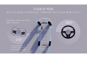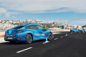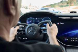 また、路面の凹凸から伝わる不快な振動が直接手元に伝わらなくなるため、運転中の快適性が飛躍的に向上する。しかし、路面状況がまったく伝わらなくなるわけではない。タイヤと路面の接触状況をシステムが計算し、メルセデス・ベンツらしい正確で直感的なステアリングの反力を人工的に生成してドライバーの手に伝えることで、安心感のある自然なフィーリングを維持している。