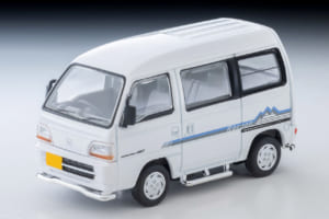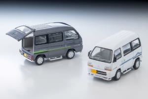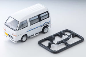 ボディカラーは白とグレーの2種類が用意されており、白はGラクーン 4WD(1994年式)、グレーは最終型に設定されたグレードのV 4WD(1997年式)を、それぞれ再現している。アクセサリーパイプやサイドステップ、カリフォルニアミラーや専用デカールなどによるRV車(当時の呼称)らしい佇まいが見事だ(ミニカーのサイドグラフィックはデカールではなくタンポ印刷)。どちらもサイドミラーがユーザー取り付け部品として付属、予価4,400円(税込)で2026年9月発売予定。