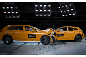 2023年10月、メルセデス・ベンツは2台のBEVのフロントオフセット衝突を公に実施した世界初の自動車メーカーとなった。テストはジンデルフィンゲンのメルセデス・テクノロジーセンター(MTC)で行われ、EQAとEQS SUVが実際の事故条件を想定し、50%重なった状態で、それぞれが時速56km/hで正面衝突テストを実施。