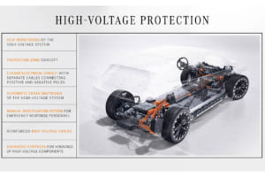 例として、正極と負極の独立した配線や重大な衝突が発生した場合、自動的にスイッチがオフになる自己監視高電圧システムがある。また、設計者は全てのHVエレメントを車両の衝突防止領域に配置し、車両のフロアにあるバッテリーを保護する。