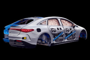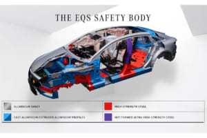 特にEQSのドアシルには、大型のアルミニウム押出材が使用されており、安定したバッテリーケースと他の対策の組み合わせにより、高電圧バッテリーの事故安全性が高くなっている。EQSのセーフティボディの材質構造は、アルミニウム、鋳造アルミニウム、高張力鋼、超張力鋼である。加えて、アルミニウムを多く含む素材をインテリジェントに組み合わせて、高強度の鋼から作られた補強材は、高い安全要件を達成するために使用されている。EQSのサイドドアのアルミニウムシートの下には、アルミニウム押出材があり、側面衝突が発生した場合にボディ構造に力を分散させる。
