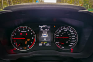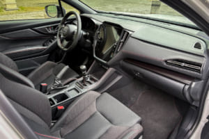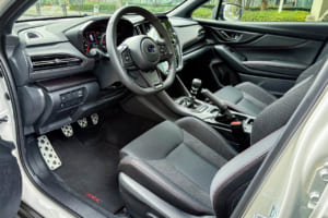 着座感や操作系、情報表示といった運転環境面は我々が目慣れたスバル車そのものだ。センタートンネルやセンターデフによる足元周辺の左右差が極めて小さいことも美点のひとつゆえ、右ハンドル化によるペダルレイアウトの影響は無視できる範疇だろう。ちなみにSTI Sport#をみるとサイドブレーキは右ハンドル化に合わせて右側に置かれていた。この辺りはスバルの仕事の丁寧さを感じるところだ。
