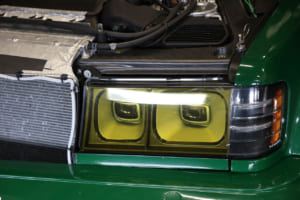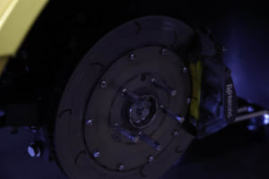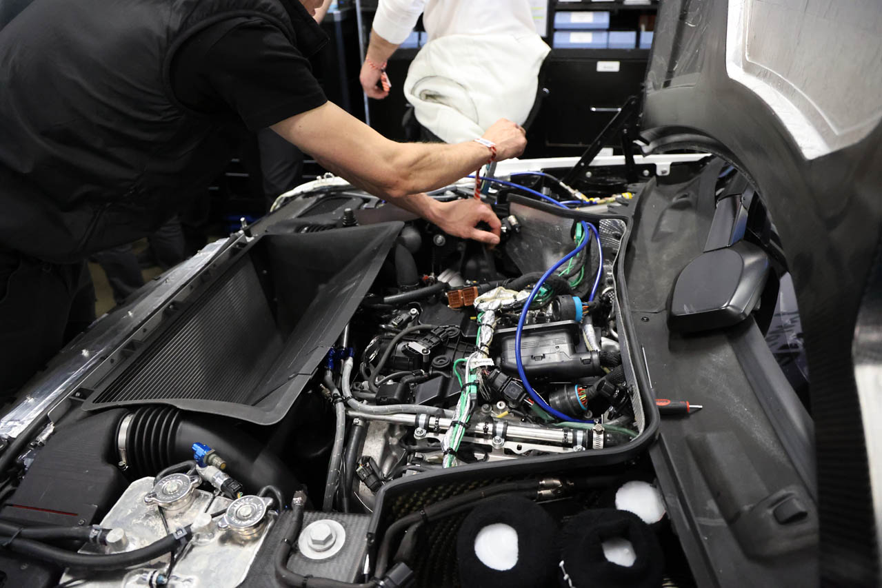 開かれたエンジンフードの下を見ると、最高出力500psを発生するメルセデスAMG用3.0L V6ツインターボエンジンはフロントアクスルより後方にマウントされており、6速MTギアボックスとデフが一体化したトランスアクスルが採用されているのがわかる。さらにボディのアウターパネルだけでなく、ラジエターやエンジンフード、バンパーなどを支えるフレームもカーボンコンポジット製に置き換えられているようだ。もちろん、タイヤとホイールは当時風のオマージュではなく、これらも最新のものである。
