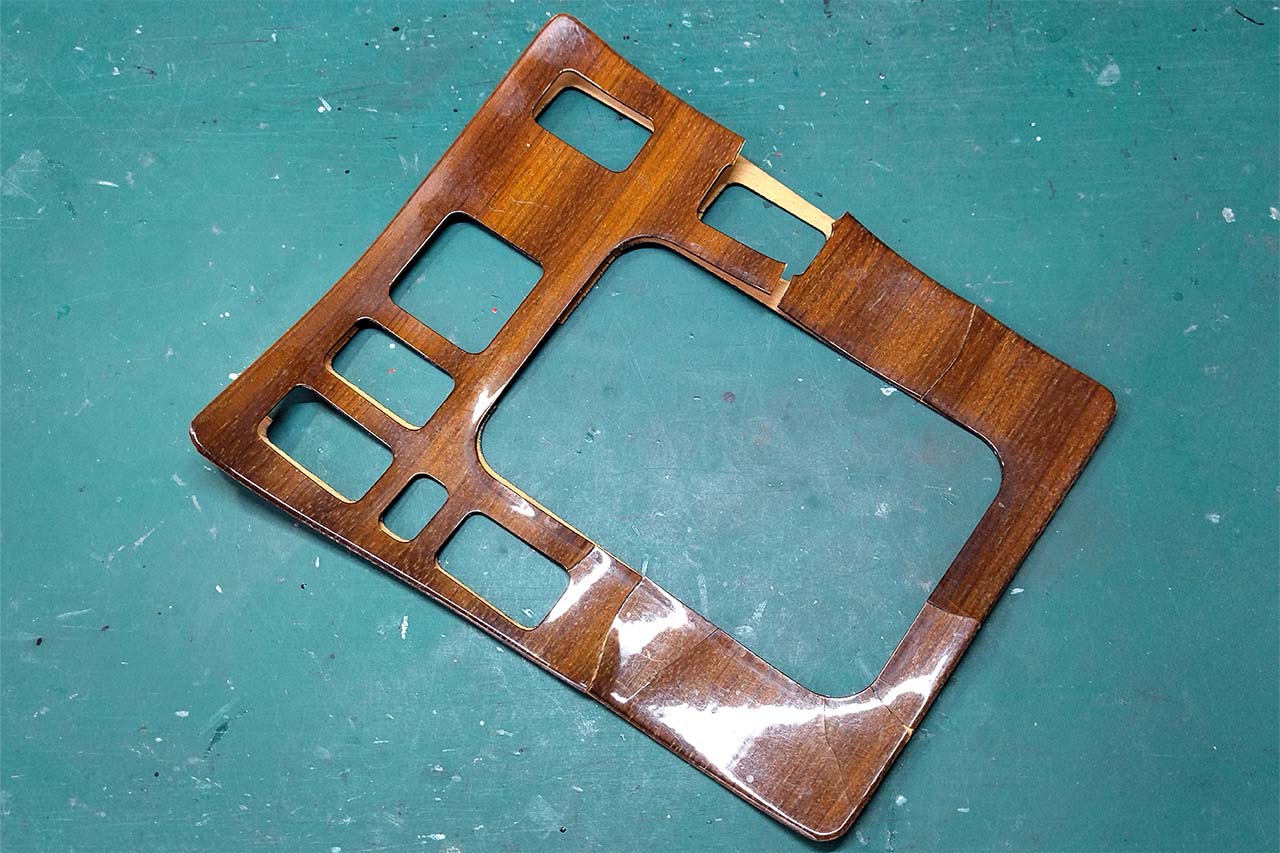 先月、シフトコンソールのハザードスイッチを交換したおり、反り上がって割れてしまったウッドパネルがスイッチを押す時に邪魔なので、剥がしてしまいました。スイッチは無事に修理できましたが、地板剥き出しのコンソールはどうにも見栄えが悪いですね。ウッドパネルの補修は不可能ではありませんが、かなり時間と手間がかかりそうです。