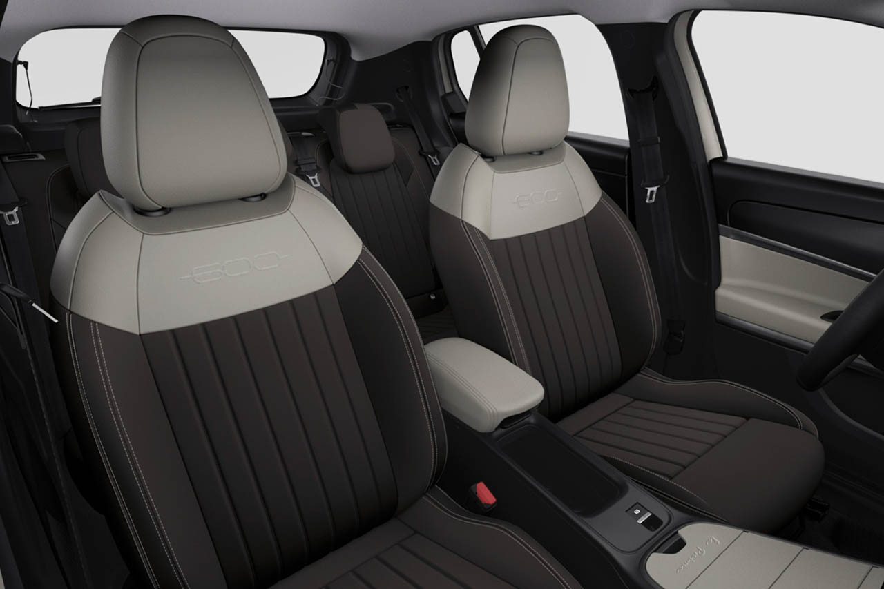 エクステリアの最大の特徴は、好評を得ている「Crema Cappuccino」のボディカラーをベースに、専用の「ホワイトパッケージ」を組み合わせた点にある。具体的には、ドアミラーカバー、フロントに配された「600」エンブレム、そしてリアの「FIAT」エンブレムのすべてがホワイトで統一されている。この配色によって、車体全体に柔らかく軽やかな印象が生まれ、都会の街角に自然と馴染む繊細な美しさが際立っている。