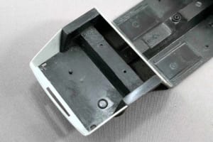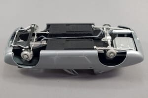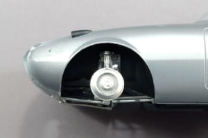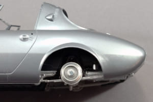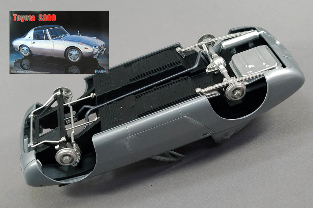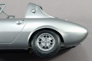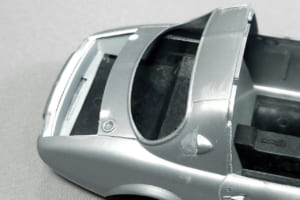 このキット、1/24スケールのカープラモとしては珍しく、トランクリッドが開閉式になっている。シャシーにトランクのフロアはあるが、ボディ後端の裏側までは届いておらず、またトランク左右と後方の壁もない。そのため完成後は、ボディ裏面が剥き出しのままになってしまう。
