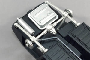 これでシャシー下側の組み立てはほぼ終わった。こうして飾ると、レストア途上の実車のようで、ちょっと楽しい。