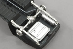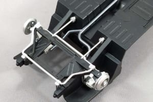 結果的に、前サスペンションはそのままで大丈夫だったが、後サスペンションはリーフスプリングとダンパーの上側にプラ板で自作したスペーサーを噛ませて、0.5mmほど車高を上げた。またリーフスプリング前側のモールドを少し削って、車軸の位置を約1mm前に寄せた。
