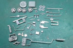 そこで、部分ごとにある程度、部品を接着してユニット化し、塗装してから車高などの確認・調整をしつつ取り付けることにした。これは旧い金型のキットを組む時にしばしばおこなうやり方だ。