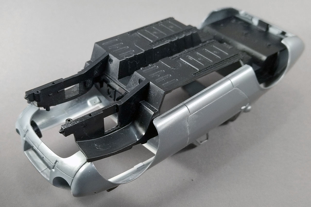 この加工のせいで、ボディとシャシーの合体に不都合が生じた。本来はシャシー前側を先に入れて、後側をあとから入れるのだが、延長したトランクフロアがボディ後端の裾に干渉し、入らなくなってしまったのだ。もともとトランクフロアが短くできていたのは、これが理由だった。