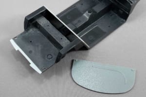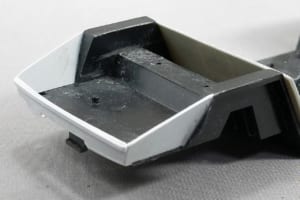 トランクフロア後端を延長したせいで、シャシーがボディに入らなくなってしまった。この状態で干渉しているシャシー前端のホイールハウスとボディのバランスパネル後端を0.5mmずつカットして、後ろを先に入れても干渉しないようにした。