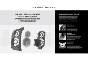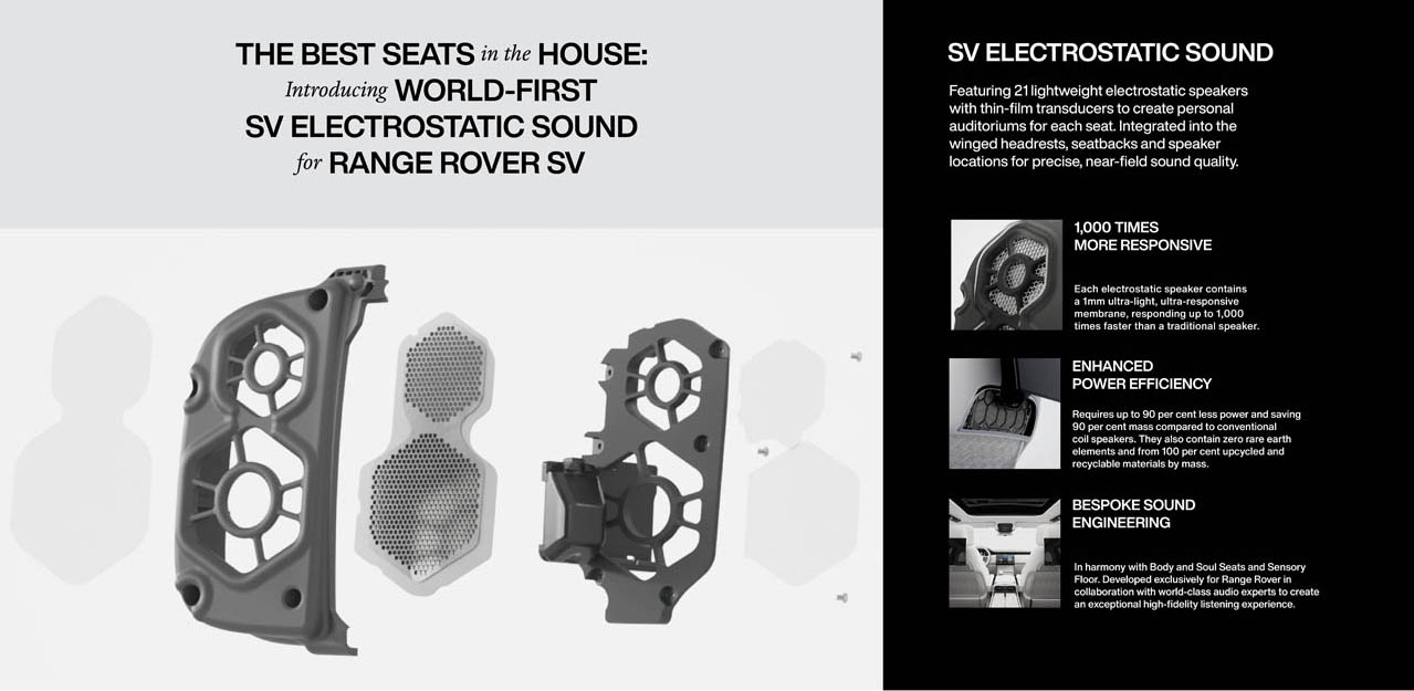 このレンジローバーSVウルトラにおける最大の技術的トピックは、ハイファイ静電サウンド技術を自動車として初めて導入したことである。「SV静電サウンド」システムはすべてのSVモデルに専用オプションとして設定され、このSVウルトラで初デビューを飾る。
